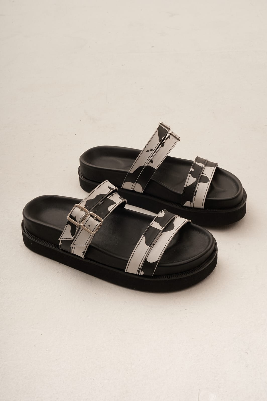 Un diseño sofisticado que fusiona calidad y estilo. Elaboradas en cuero vacuno, con base artesanal de 3 cm y plantilla acolchonada que aporta máximo confort. Disponibles en negro liso, animal print y negro vaquita, ideales para completar tus looks con un toque moderno y distinguido.