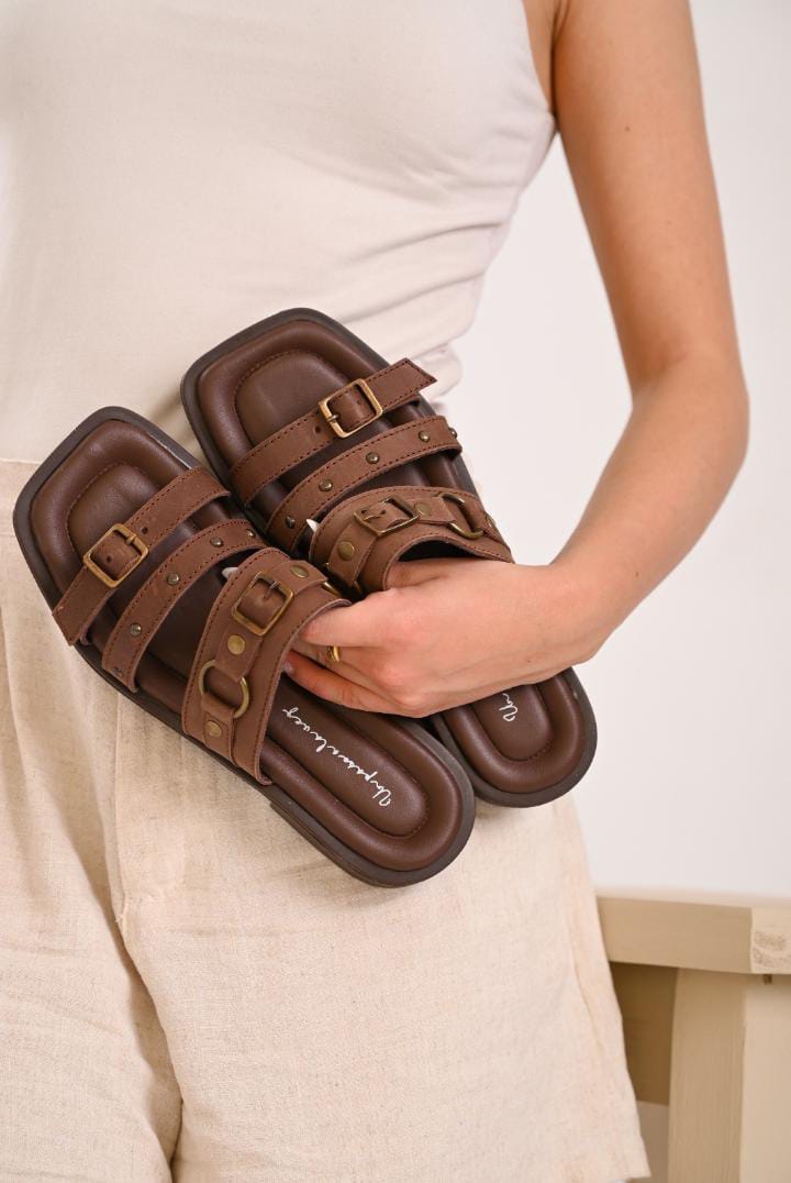 ✨ Sandalias de diseño moderno y versátil, confeccionadas en cuero con detalles metálicos que realzan su estilo único. Perfectas para acompañarte en tu día a día, combinando comodidad, resistencia y un toque sofisticado en cada paso.