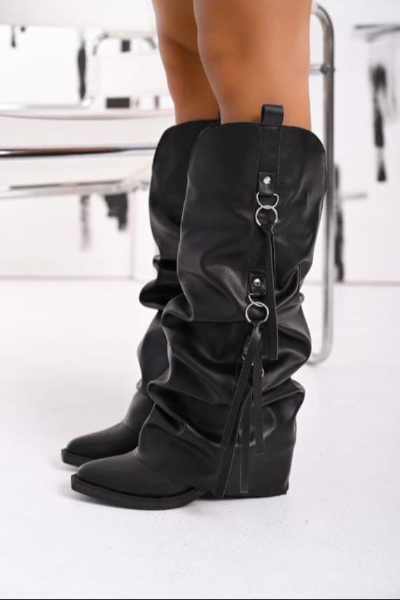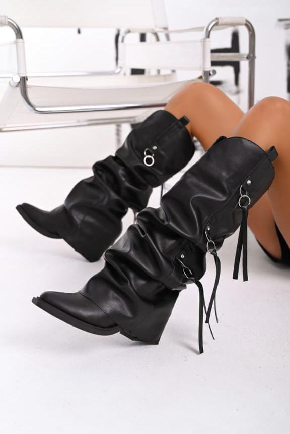 Estas botas negras de diseño único combinan elegancia y actitud en cada detalle: cuero de acabado impecable, hebillas metálicas y un look arriesgado que roba miradas.