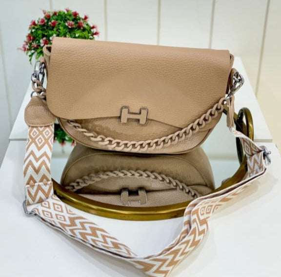 Un diseño moderno y sofisticado que combina practicidad con estilo. Fabricada en material texturado de alta calidad, cuenta con un delicado detalle trenzado en la tapa y herraje metálico en forma de “H” que aporta un toque elegante. Su correa regulable con estampado étnico en blanco y negro la convierte en un accesorio versátil, ideal para elevar cualquier look, desde lo casual hasta lo más chic.